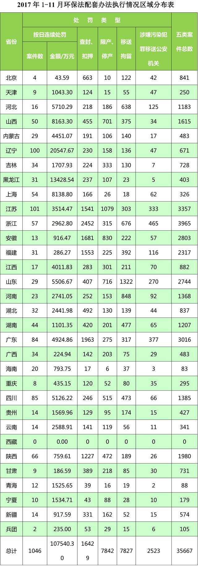 環(huán)保部想媒體通報2017年1-11月各地執(zhí)行《環(huán)境保護法》配套辦法及移送環(huán)境犯罪案件的情況。并對1-11月份案件較多的浙江、江蘇、廣東、安徽、山東、福建等地進行表揚。