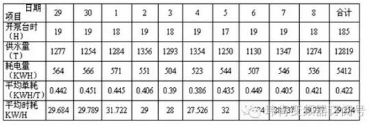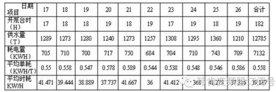 前后相比,10天供水量幾乎相等,而耗電減少1720KWH,平均單耗降低0.136KWH,節(jié)電率24.37%,平均時(shí)耗降低9.942KW/H,節(jié)電率25.37%,平均節(jié)電率達(dá)24.87%,節(jié)電效果顯著。