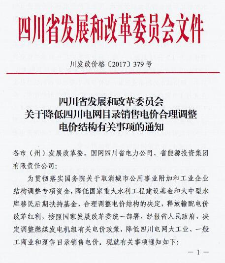 近日,四川省發(fā) 改 委發(fā)布了《四川省發(fā)展和改革委員會(huì)關(guān)于降低四川電網(wǎng)目錄銷售電價(jià)合理調(diào)整電價(jià)結(jié)構(gòu)有關(guān)事項(xiàng)的通知》(以下簡(jiǎn)稱“通知”)。通知指出,自2017年7月1日起,取消向燃煤發(fā)電企業(yè)征收工業(yè)企業(yè)結(jié)構(gòu)調(diào)整專項(xiàng)資金,降低重大水利工程建設(shè)基金和中大型水庫(kù)移民后期扶持基金征收標(biāo)準(zhǔn),降低后的征收標(biāo)準(zhǔn)分別為0.52分/千瓦時(shí)、0.62分/千瓦時(shí)。燃煤發(fā)電機(jī)組有關(guān)電價(jià)政策另行明確。具體情況如下: