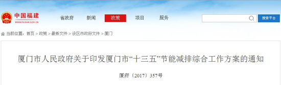 廈門(mén)市印發(fā):《廈門(mén)市“十三五”節(jié)能減排綜合工作方案》