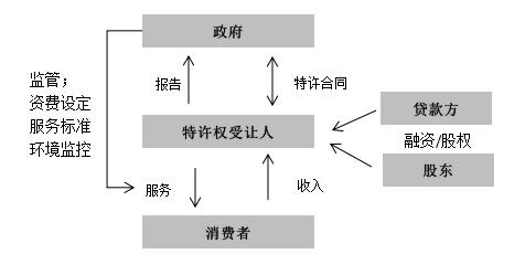 特許經(jīng)營權(quán)允許社會資本運營商(受讓人)在指定區(qū)域內(nèi)負資全商提供公共服務(wù),包括系統(tǒng)的運營、維護,征收費用,管理,建設(shè)和修復(fù)等,同時,運營商負責(zé)所有資本投資。盡管社會資本運營商負赍提供資產(chǎn),該資產(chǎn)即使在特許期內(nèi)也屬于政府所有。政府負確定實施標準,并確保受讓人能達到標準。從本質(zhì) 上講,待許經(jīng)營模式將政府的角色從服務(wù)提供者轉(zhuǎn)變?yōu)榉?wù)價格和質(zhì)量的規(guī)范者。