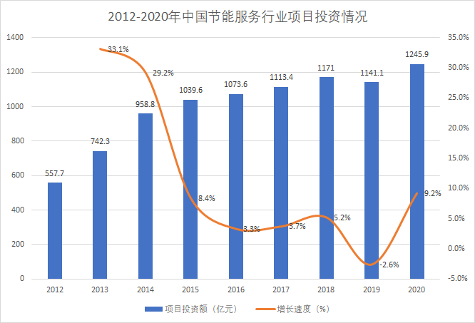 近年來(lái),中國(guó)節(jié)能服務(wù)能效項(xiàng)目穩(wěn)健開(kāi)展,2020年,節(jié)能服務(wù)行業(yè)項(xiàng)目投資額約為1245.9億元,同比上漲9.2%。