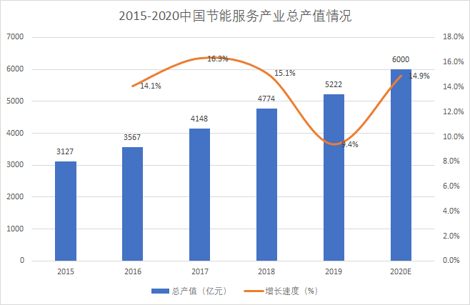 近年來(lái),節(jié)能服務(wù)產(chǎn)業(yè)總產(chǎn)值不斷增長(zhǎng),呈逐年上漲趨勢(shì)。中國(guó)節(jié)能協(xié)會(huì)數(shù)據(jù)顯示,2019年我國(guó)節(jié)能服務(wù)產(chǎn)業(yè)總產(chǎn)值達(dá)5222億元,同比增長(zhǎng)9.38%。根據(jù)《“十三五”節(jié)能環(huán)保產(chǎn)業(yè)發(fā)展規(guī)劃》,到2020年節(jié)能服務(wù)業(yè)總產(chǎn)值達(dá)到6000億元。我國(guó)節(jié)能服務(wù)行業(yè)潛力巨大。