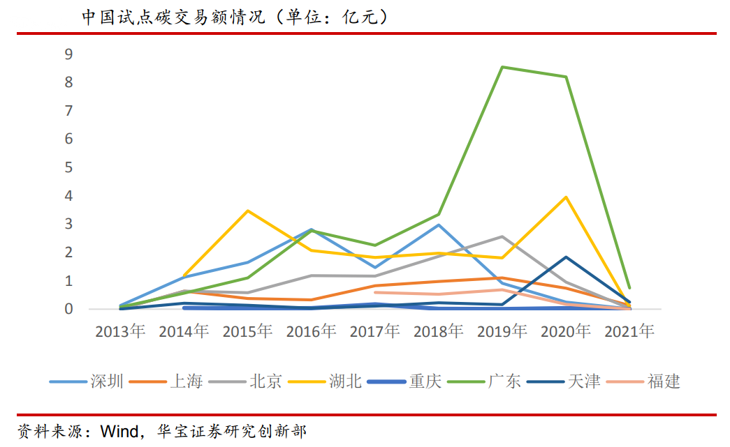 目前,全國共有8個地區(qū)在開展碳排放權(quán)交易試點,包括:北京、天津、上海、重慶、湖北、廣東、深圳、福建。截至2020年11月,試點碳交易市場累計配額成交量約為4.3億噸CO?e,累計成交額近100億元人民幣。