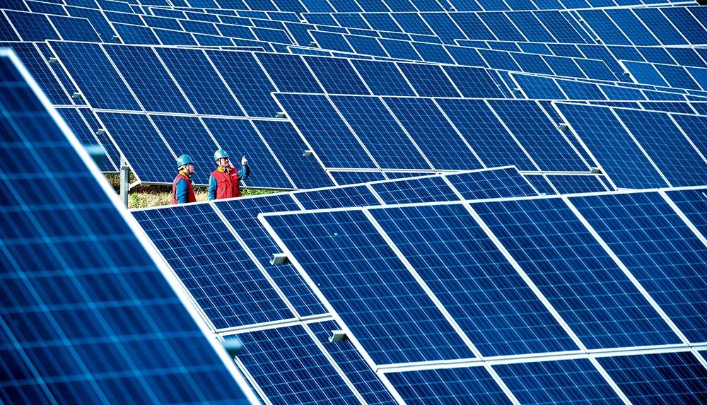 ▲ 4月28日,國網(wǎng)山東淄博供電公司技術(shù)人員巡檢光伏電站。遠德亮攝