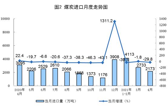 原煤生產(chǎn)有所下降。4月份,生產(chǎn)原煤3.2億噸,同比下降1.8%,比2019年4月份增長4.0%,兩年平均增長2.0%,日均產(chǎn)量1074萬噸;進(jìn)口煤炭2173萬噸,同比下降29.8%。