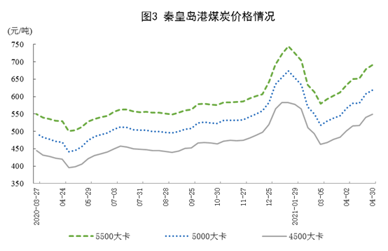 ? ? ? 港口煤炭綜合交易價(jià)格持續(xù)上漲。4月30日,秦皇島港5500、5000和4500大卡煤炭價(jià)格分別為每噸690元、618元、549元,比4月2日分別上漲56元、51元和47元。