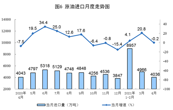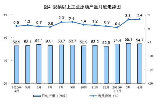 1-4月份,生產(chǎn)原油6563萬噸,同比增長1.9%,比2019年1-4月份增長3.9%,兩年平均增長1.9%;加工原油23210萬噸,同比增長14.2%,比2019年1-4月份增長10.3%,兩年平均增長5.0%。