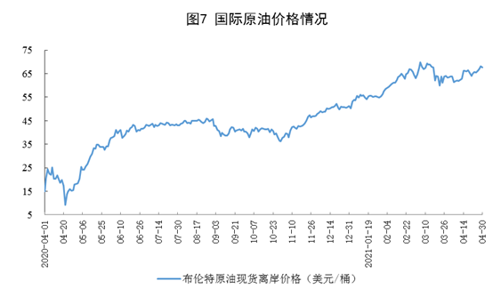 ? ? ? ?原油進(jìn)口由升轉(zhuǎn)降,國際原油價(jià)格有所上漲。4月份,進(jìn)口原油4036萬噸,同比下降0.2%;1-4月份,進(jìn)口原油17958萬噸,同比增長7.2%。4月30日布倫特原油現(xiàn)貨離岸價(jià)格為67.73美元/桶,比3月31日的63.52美元/桶上漲6.6%。