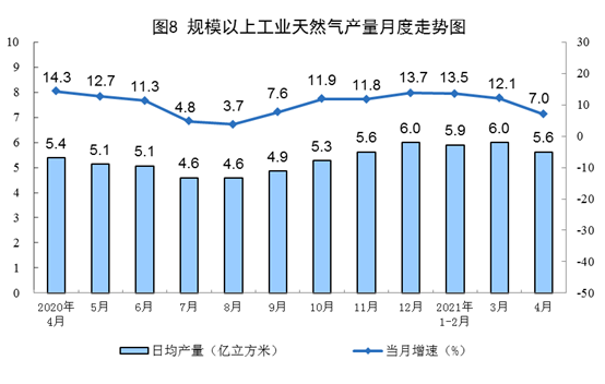 ? ?天然氣生產(chǎn)保持穩(wěn)定增長。4月份,生產(chǎn)天然氣169億立方米,同比增長7.0%,比2019年4月份增長22.3%,兩年平均增長10.6%,日產(chǎn)5.6億立方米。