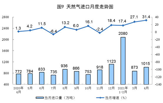 天然氣進(jìn)口增速加快。4月份,進(jìn)口天然氣1015萬噸,同比增長31.4%。1-4月份,進(jìn)口天然氣3946萬噸,同比增長22.4%。