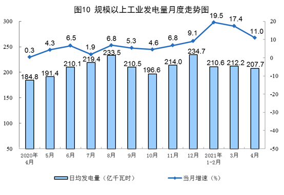 ? ? ? ?電力生產(chǎn)較快增長。4月份,發(fā)電6230億千瓦時(shí),同比增長11.0%,比2019年4月份增長11.3%,兩年平均增長5.5%,日均發(fā)電207.7億千瓦時(shí)。1-4月份,發(fā)電25276億千瓦時(shí),同比增長16.8%,比2019年1-4月份增長10.9%,兩年平均增長5.3%。