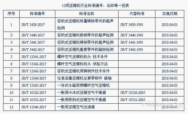 2017年第48號(hào)中華人民共和國(guó)工業(yè)和信息化部公告,工業(yè)和信息化部批準(zhǔn)發(fā)布了壓縮機(jī)行業(yè)標(biāo)準(zhǔn)12項(xiàng)看具體內(nèi)容見(jiàn)下表。