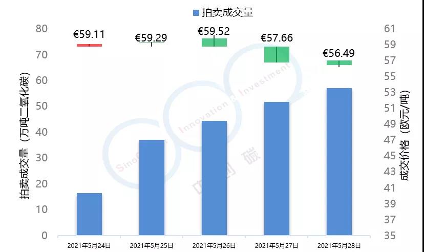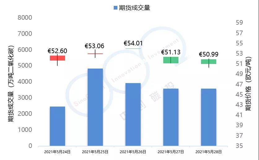2021年5月24日至5月28日,由于全球能源市場表現(xiàn)較為疲軟,市場投資者對于配額需求的預(yù)期不景氣,歐盟碳市場在本周總體呈現(xiàn)下跌趨勢,在本周三漲至53.59歐元/噸的頂峰后,隨即下跌近5個點(diǎn),最終收于50.95歐元/噸,回落至接近本月初水平。英國碳市場自上周三開市后,在本周迎來交易的第一個整周,在短期試探了59.52歐元/噸的碳價后,英國碳價逐步回落至56.49歐元/噸,該趨勢與歐盟碳市場基本保持一致。本周歐盟碳市場期貨成交量達(dá)到1.84億噸,配額拍賣量為平均每天300萬噸左右。英國碳市場本周拍賣成交量達(dá)到207萬噸。據(jù)悉,英國政府正在考慮增加2021年英國碳市場配額的拍賣供應(yīng)。