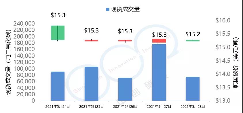 2021年5月24日至5月28日,本周韓國碳價延續(xù)上周的下跌趨勢,由15.3美元/噸下跌至15.2美元/噸。本周韓國碳市場成交量達(dá)到52萬噸,遠(yuǎn)高于上周7萬噸的水平。