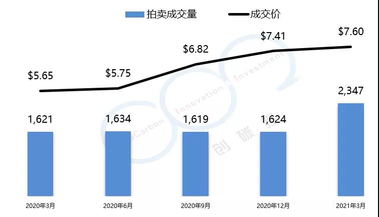 RGGI碳市場的初始配額發(fā)放以拍賣為主,每個季度舉行一次拍賣。2021年第一季度拍賣成交均價為$7.60美元,較上一季度漲幅為2.5%。由于弗吉尼亞州的加入,RGGI總成交量創(chuàng)歷史新高,達(dá)到了2347萬噸。以下是由中創(chuàng)碳投統(tǒng)計(jì)的RGGI近一年的交易情況。