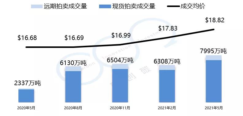 加州-魁北克碳市場的初始配額發(fā)放以拍賣為主,每個季度舉行一次拍賣。2021年5月的第27次拍賣均價與總成交量創(chuàng)歷史新高。拍賣均價為18.82美元,較上一季度漲幅為5.6%,總成交量為7995萬噸。以下是由中創(chuàng)碳投統(tǒng)計(jì)的加州-魁北克碳市場近一年的交易情況。