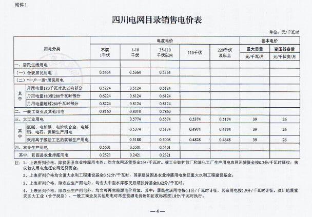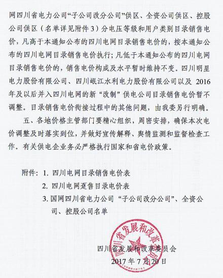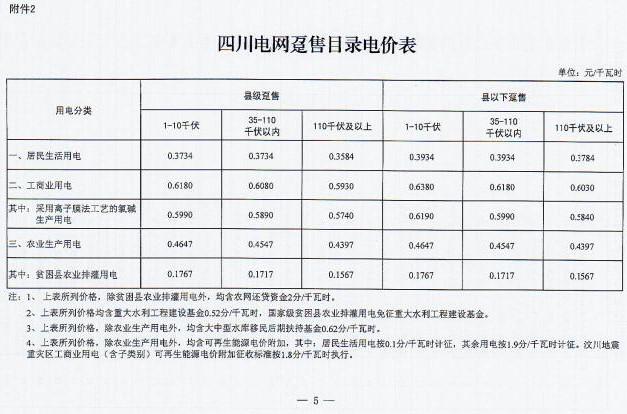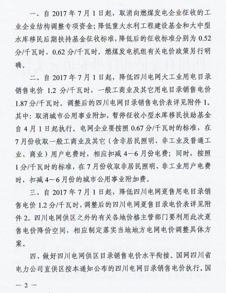 近日,四川省發(fā) 改 委發(fā)布了《四川省發(fā)展和改革委員會關(guān)于降低四川電網(wǎng)目錄銷售電價合理調(diào)整電價結(jié)構(gòu)有關(guān)事項的通知》(以下簡稱“通知”)。通知指出,自2017年7月1日起,取消向燃煤發(fā)電企業(yè)征收工業(yè)企業(yè)結(jié)構(gòu)調(diào)整專項資金,降低重大水利工程建設(shè)基金和中大型水庫移民后期扶持基金征收標(biāo)準(zhǔn),降低后的征收標(biāo)準(zhǔn)分別為0.52分/千瓦時、0.62分/千瓦時。燃煤發(fā)電機組有關(guān)電價政策另行明確。具體情況如下: