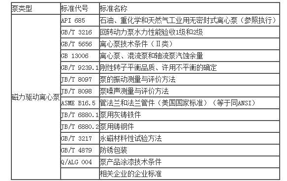 六、泵的設(shè)計、制造、檢驗應(yīng)符合有關(guān)標準、規(guī)范的規(guī)定,常用磁力驅(qū)動離心泵的類型、標準代號及標準名稱見表1。