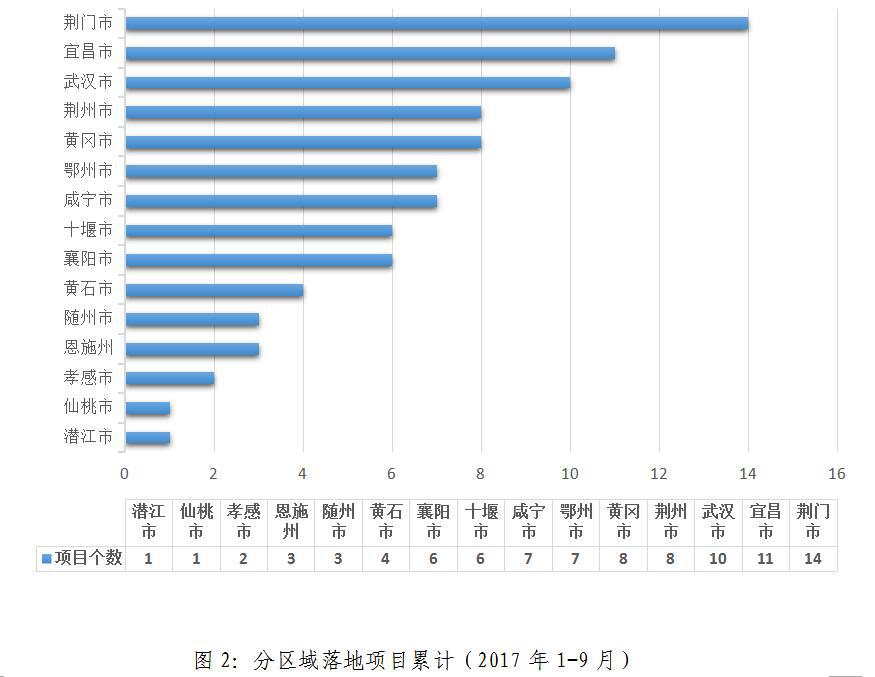 2017年1-9月,累計新落地項(xiàng)目數(shù)排名:荊門市(14個)、宜昌市(11個)、武漢市(10個)、荊州市(8個)、黃岡市(8個)、荊州市(8個)、鄂州市(7個)、咸寧市(7個)、十堰市(6個)、襄陽市(6個)、黃石市(4個)、隨州市(3個)、恩施州(3個)、孝感市(2個)、仙桃市(1個)、潛江市(1個)。