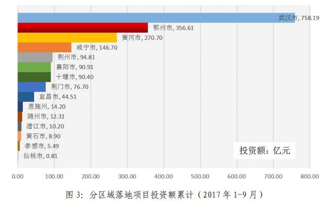 2017年1-9月,累計新落地項(xiàng)目投資額排名:武漢市(758.19億元)、鄂州市(356.61億元)、黃岡市(270.70億元)、咸寧市(146.70億元)、荊州市(94.81億元)、襄陽市(90.91億元)、十堰市(90.40億元)、荊門市(76.70億元)、宜昌市(44.51億元)、恩施州(14.20億元)、隨州市(12.31億元)、潛江市(10.2億元)、黃石市(8.90億元)、孝感市(5.49億元)、仙桃市(0.81億元)。