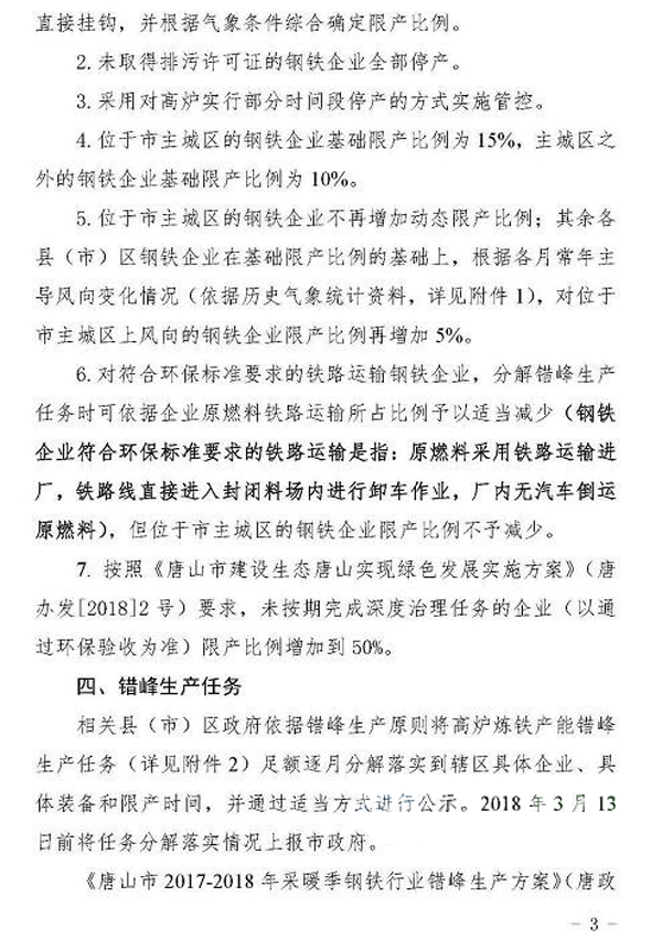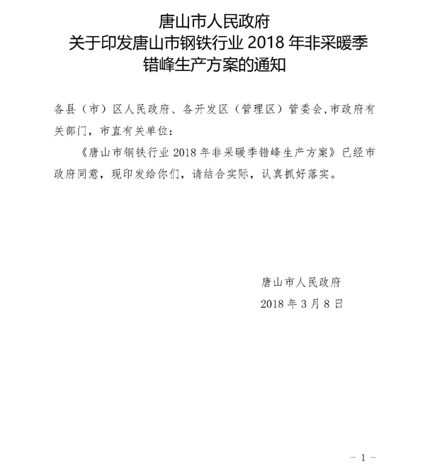 日前,《唐山市鋼鐵行業(yè)2018年非采暖季錯峰生產(chǎn)方案》經(jīng)市政府同意,已正式下發(fā)。方案中明確了錯峰生產(chǎn)依據(jù)和原則,綜合考慮唐山市環(huán)境空氣質(zhì)量現(xiàn)狀、鋼鐵企業(yè)所處區(qū)域和氣象條件,對全市鋼鐵企業(yè)實施非采暖季精準化、差異化錯峰生產(chǎn)。全文如下: