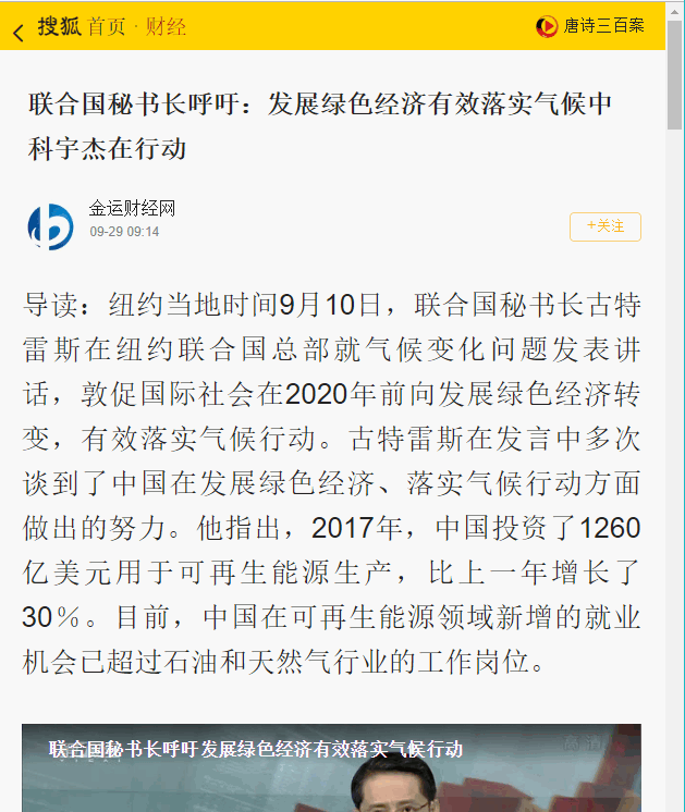 導(dǎo)讀:紐約當(dāng)?shù)貢r間9月10日,聯(lián)合國秘書長古特雷斯在紐約聯(lián)合國總部就氣候變化問題發(fā)表講話,敦促國際社會在2020年前向發(fā)展綠色經(jīng)濟轉(zhuǎn)變,有效落實氣候行動。古特雷斯在發(fā)言中多次談到了中國在發(fā)展綠色經(jīng)濟、落實氣候行動方面做出的努力。他指出,2017年,中國投資了1260億美元用于可再生能源生產(chǎn),比上一年增長了30%。目前,中國在可再生能源領(lǐng)域新增的就業(yè)機會已超過石油和天然氣行業(yè)的工作崗位。